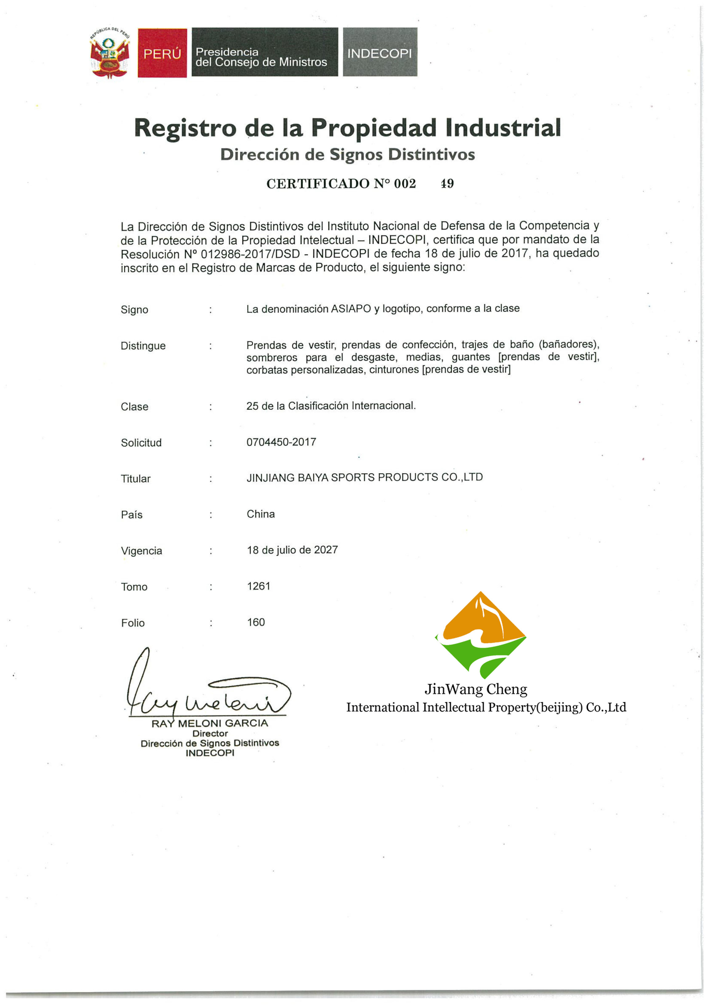 【秘鲁】商标申请成功样本