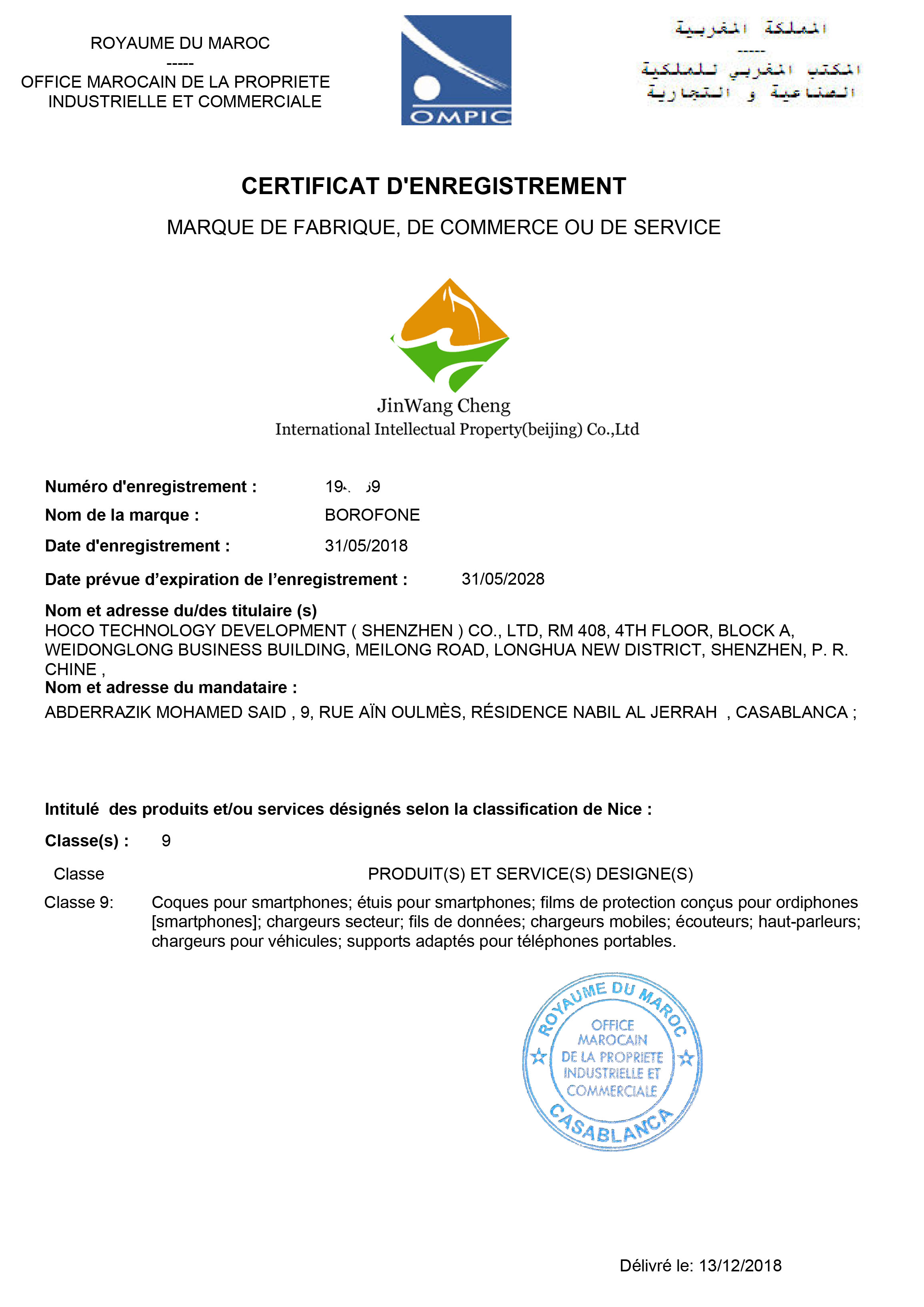 【摩洛哥】商标申请成功样本