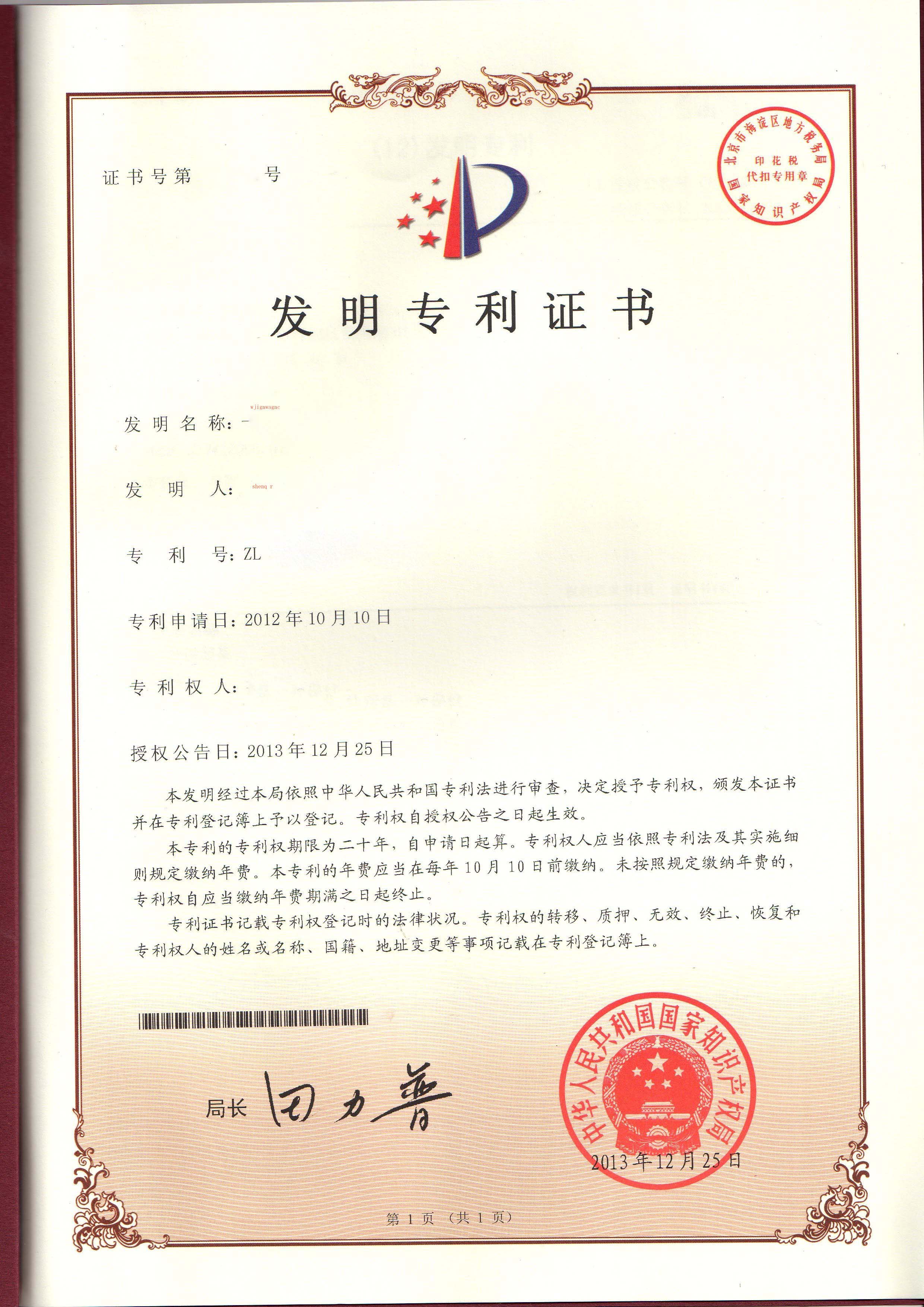 【中国】发明专利证书